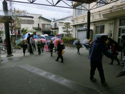 専科の先生や学校主事さん方と一緒に、傘をさしながら、仲よく列をつくって下校していました。