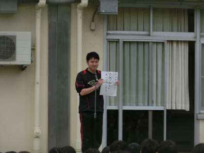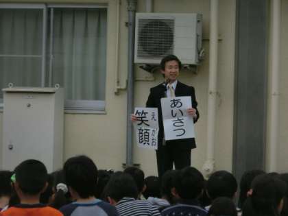 また、看護当番の教員から、今週の週目標“笑顔で元気よくあいさつをしよう!”が伝えられ、今週1週間の学校生活がスタートしました。元気に仲よく学校生活を送ってほしいと願っています。