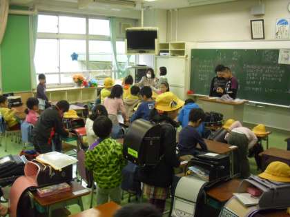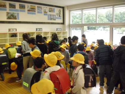 今日は朝から雨が降り出しました。そんな中登校した1年生のお世話として、ランドセルを拭いてあげたり、長靴を靴箱に入れる手伝いをしたりしました。