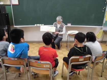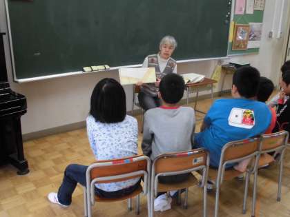 読んでいただいた本は、すべての学年で、「はらぺこあおむし」と「くれよんのくろくん」、さらに、1,3年生は「たまご」と「うさこちゃん」、4,5年生は「スモールさんはおとうさん」「オムライスへイ!」「ねんねこさっしゃれ」「こいぬがうまれるよ」のお話を聞きました。