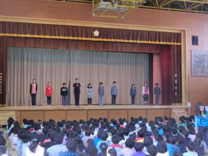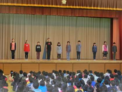 代表委員会、集会委員会、放送委員会、運動委員会、音楽委員会、広報委員会、図書委員会、飼育・栽培委員会、保健・給食委員会、エコ委員会の10委員会の委員長さんが、委員会の活動内容や委員長としての抱負を、全校の前で堂々と発表することができました。