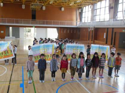 国語科で学習している「ピータイルねこ」という物語から、3年生は「ピータイル校歌」を1年生への贈り物に作りました。1年生を迎える会に向けて、リハーサルも行いました。1年生が喜んでくれるか楽しみです。