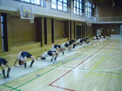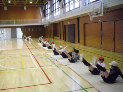 V字バランスやブリッジなどの技を知り、試しにやってみると「うっ。」とうめく声。見た目より筋力を必要とすることが分かって、表情はいっそう真剣になりました。できるようになってきたところで、全員が息を合わせてそろえる練習もしました。