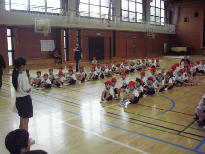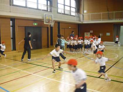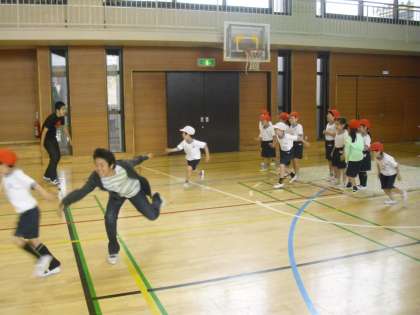 初日の記念として、代表委員会が企画した「島わたりオニ」をしました。6つの島を次から次へと渡っていく1年生と、島の間で1年生を捕まえようとするオニ役の代表委員。元気に体を動かして、仲良く楽しく過ごすことができました。