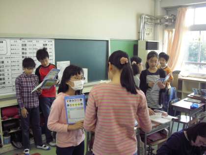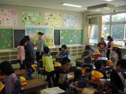 今朝も1年生のお世話当番が、1年生の教室で待っていました。しかし1年生もだいぶ学校生活に慣れてきたのか、6年生の手助けがなくてもすいすいと身支度を整えます。もうそろそろお役御免の時期が近くなって来たのかも知れません。