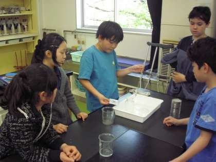 理科では「ものを燃やした後のビンの中では、二酸化炭素が増えているか。」を確かめるため、石灰水を使った実験を行いました。