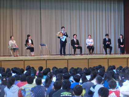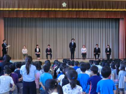 今日の6校時に体育館で、2年生から6年生までの子どもたちと教職員が、この3月まで本校に勤務されていた教職員を迎えて、離任式を行いました。