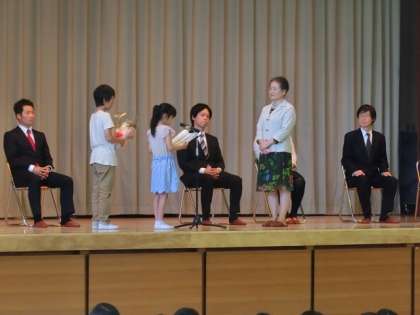 今日は7名の先生方が出席され、子どもたちからお礼と感謝のメッセージが伝えられ、花束を贈りました。離任された先生方からも、一言ずつお話をいただき、最後に全員で校歌を歌い、体育館フロアで見送り、お別れをしましした。
