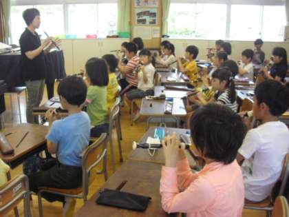 配られたばかりのリコーダーを持ち、真剣な表情で穴の押さえ方や息の吹き方を聞いて、演奏に取り組んでいました。