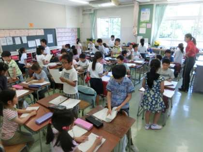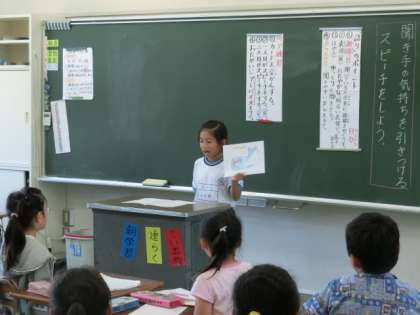 5校時の3年1組では、国語の学習“小さなできごと”の4時間目の学習活動が行われていました。きょうの学習のめあては“聞き手の気持ちを引きつけるスピーチをしよう!”で、発表の仕方や聞き方について考え、個人で、ペアで、スピーチの練習に取り組んでいました。語りのポイント<視線・表情・はやさ・声の大きさ>、ペア練習の仕方についても学び、一人ひとりが意欲的に、また友達との協働学習に積極的に取り組んでいました。