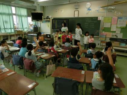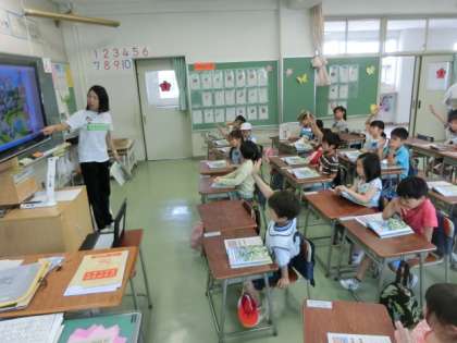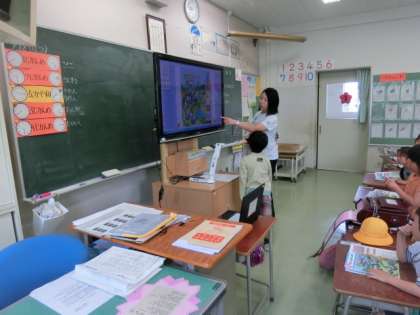 電子黒板に提示された絵をもとに、個数や順序を正しく数えたり表したりする活動を通して、順序を表す数を知ったり、言葉と順序数を使ってものの位置を表したりする学習を行っていました。画面に集中し、担任からの問いかけに意欲的に応えていた子どもたち。