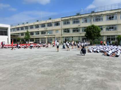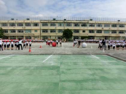 赤白の隊形に集合し、準備運動の隊形づくりと動きの練習を行いました。次に、午前の部の応援合戦とエール交換、最後に全校競技の大玉送りの練習を行いました。それぞれの隊形や動き・内容を確認しながら、最後まで一生懸命取り組んでいました。
