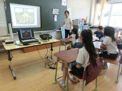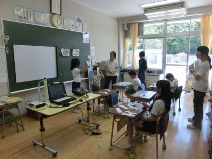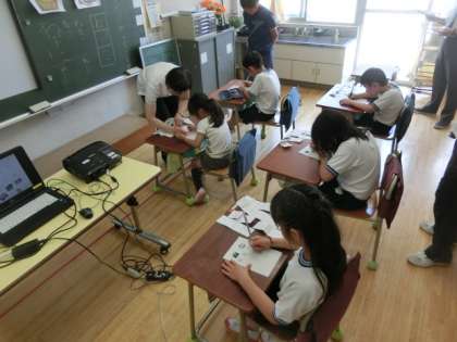 北原白秋・作「おまつり」の詩を興味をもって音読しました。次に、プロジェクターで映し出された絵を手がかりに、ちいさい「っ」がつく言葉について発表したり読んだりしました。また、身の回りの促音「っ」がつく言葉を探したり、互いに発表したり、カードに書いたりする活動を通して、促音「っ」の読み方や表記の仕方を学んでいました。