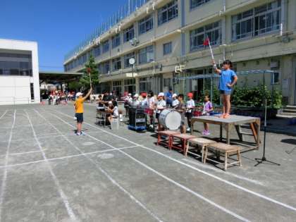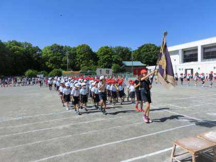今日の内容は、入場行進からの全体集合隊形・位置の確認、開・閉会式の練習、午後の部の応援合戦の練習を行いました。代表委員会、4年生以上で構成する応援団、5・6年生で構成する音楽係・プラカード係・放送係などが活躍する中、予定した練習を行うことができました。
