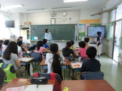 今、学習に取り組んでいるのは「単位量当たりの大きさ」です。今日は、“長さが8mで重さが480gの針金があります”事象から単位量当たりの大きさを考えたり、そこから比較する量を求めたりする学習です。自分の考えをノートに図・表や数直線を使ってまとめたり、ICT機器を活用して画面に映し出された自分のノートをつかって説明したりしながら、友達と考えを交流し合い、答えを求めていました。