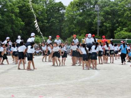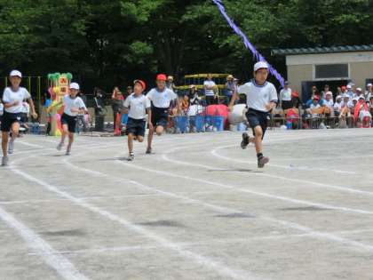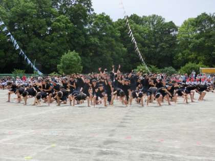 校庭全体を使いかけ声も力強く響かせ全身で踊った表現。6年生と共に戦った騎馬戦。コーナー走を工夫し、昨年より20m長くなったコースを走り抜けた短距離走。たくましさを感じさせる競技や演技を披露しました。
