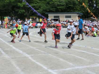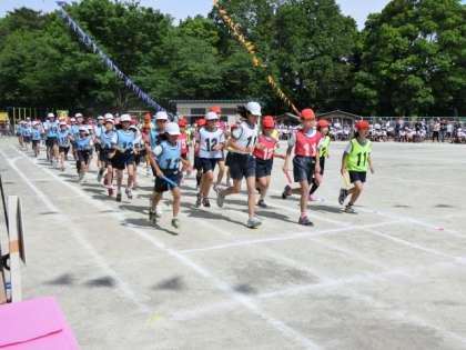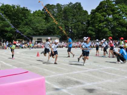一人ひとりがトラックを1周しバトンをつなぐ高学年リレー。女子の部・男子の部の順でレースが行われました。ここまでの得点も接戦となっていただけに、会場応戦席からの声援も一段と大きくなり、注目を受ける中、心を合わせてバトンをつないだ選手たち。順位・勝敗はありましたが、最後まで自分の力を出し切って走り切りました。