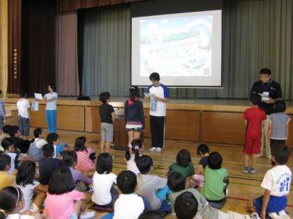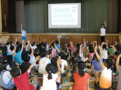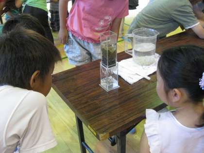 今日の1、2時間目に東京都水道局の皆さんによる出前授業「水道キャラバン」が行われました。普段使っている水道水が、どのようにして私たちの元に届くのか、DVDの映像を見ながら学習しました。安全でおいしい水を届けるための水道局の皆さんの工夫や努力がよく分かりました。また後半の学習では、濁った水をきれいにする実験を行いました。興味深く実験に取り組み、濁った水が見事きれいな水に変身し、歓声があがりました。最後には各学級の代表者が認定証をいただきました。水道水に関して、知識を深められました。