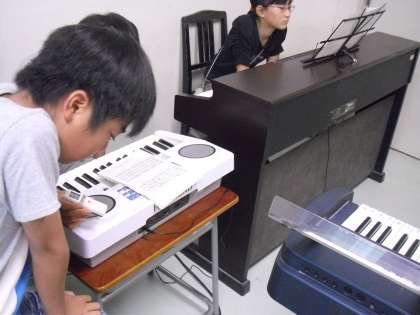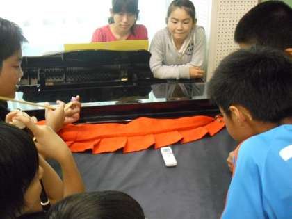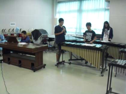 グループで合奏したものを録音し、それを即座に聴くことで改善点を挙げ、直後の合奏に生かしています。子どもたちは録音したものを聴きながら、考え、話し合って進めています。