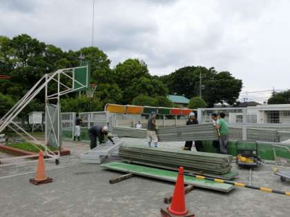 専門業者により、普段遊び場となっている場所の鉄板を、重機を使って取り除いた、移動させたりしながら、また、作業員の方々の力で、手際よく作業が進められました。