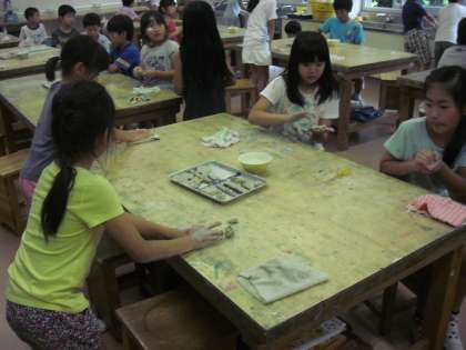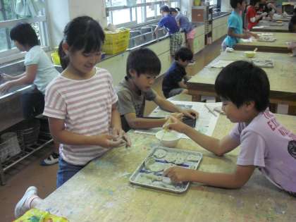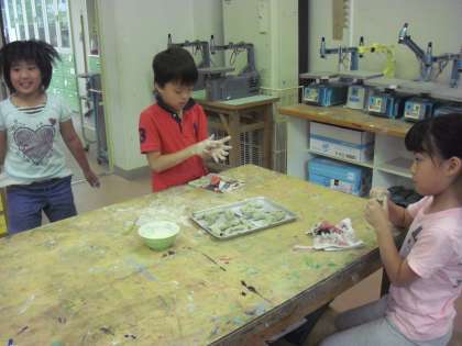 今回使用した粘土は陶芸用の粘土です。水を含ませた粘土の感触を楽しみながら、思い思いの形を作っていきました。今日作った作品は、しばらく乾燥させた後に1200度の高温で焼成します。「え〜、1200度!」と子どもたちから驚きの声があがりました。