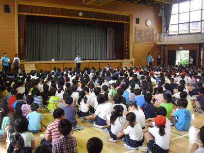 給食室から出火したことを想定し、口元にハンカチなどを当てて火元の近くを通らず、迅速に避難しました。子どもたちの表情はみな真剣そのものでした。