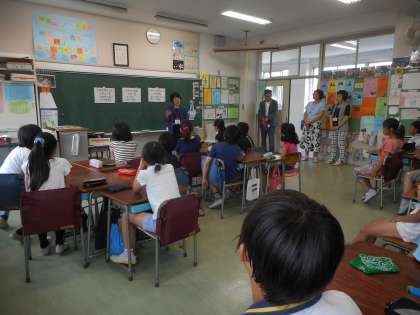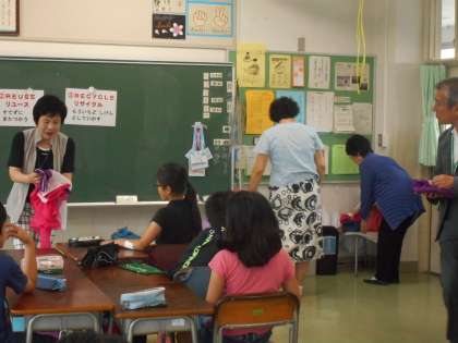 本日、ふろしきを使ったエコの学習を行いました。消費生活課の方々が、講師として来てくださり、3R(リデュース・リユース・リサイクル)の話をしてくださいました。1年間で1人あたり、300枚ほどのビニール袋を利用しているそうで、それを聞いた子どもたちはとても驚いていました。後半はふろしきを使って、いろいろな包み方を学びました。包み方だけでなく、バンダナを使った帽子やネクタイの作り方も教えてくださいました。エコの大切さを学ぶことができました。今後、社会科の学習に生かしていきたいと思います。