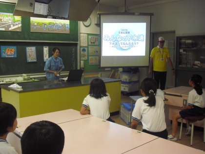今日の午前中に、社会科の学習で下水道局による出前授業が行われました。私たちが使って汚れた水がどのようにして、きれいにされているのかを学びました。昔の神田川と今の神田川の写真を比べることで、川の水がきれいになったことを実感することができました。また実験をすることで、濁りをとる仕組みを実際に見ることができました。排水溝に油を流すと、下水道管にできてしまうという、「オイルボール」の実物も見せていただきました。きれいな川や海を守るためにも、一人ひとりの心がけが大切であることを学びました。今後の社会科の学習で生かしていきたいです。