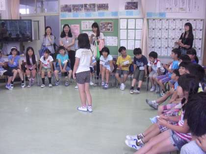 「How are you?」「I'm ○○」のフレーズを中心に、感情を表す「happy」「angry」「sad」「sleepy」などの言葉を学びました。講師の方の問いかけに、夢中になって答えていた子どもたち。楽しく活動することができました。