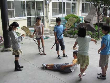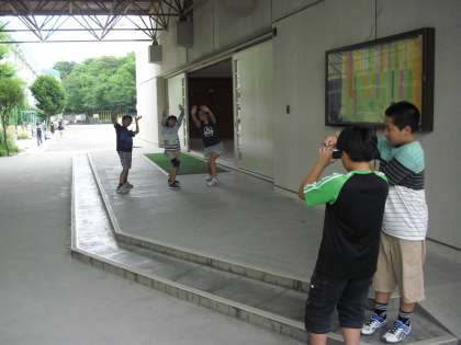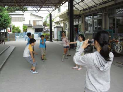 グループで考えた「瞬間」を体現し、それをデジタルカメラで撮影して発表するというものです。子どもたちはカメラのモニターを見ながら、もっと面白くしたいという意欲をもって話し合っていました。
