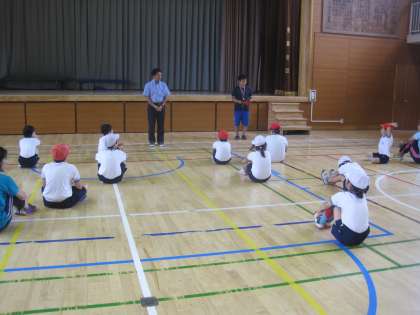 雨が降ってしまったので、今日は体育館で「プール開き」をしました。