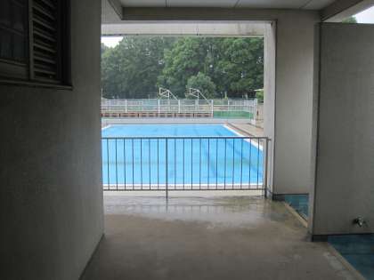 その後、シャッター越しでしたが、遠くからプールを見て、トイレの場所などを確認しました。