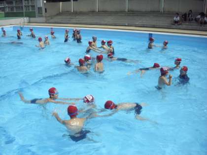 やや冷たい水温でしたが、子どもたちは歓声を上げながら水の感触を楽しみ、けのびやバタ足などの泳ぎにも一生懸命に取り組みました。