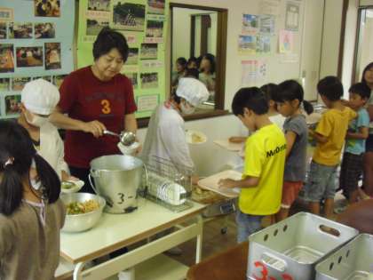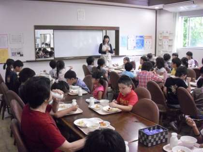 普段とは違う場所で食べる給食に子どもたちは大喜び。さらに、サクランボも特別に付いてきて大満足でした。
