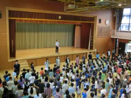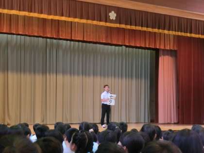久しぶりの雨の月曜日となり、体育館で全校朝会を行いました。
