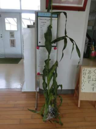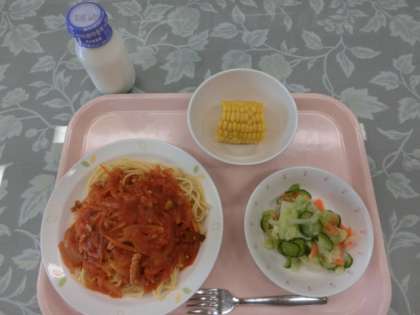 今日の献立は、「蒸しとうもろこし、スパゲッティピザ風ソース、グリーンサラダ、牛乳」でした。千葉県から食材として入荷したとうもろこし。一緒に畑から届いた1本の成長したとうもろこしを見て、驚いていた1年生。“とってもおいしかったよ!”と口々に答えてくれました。