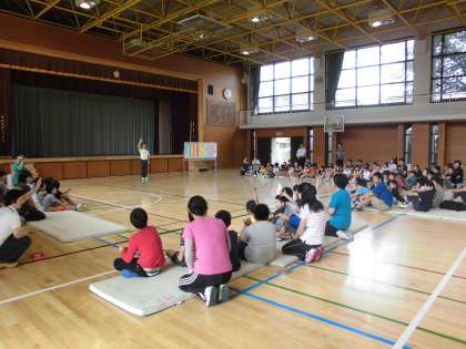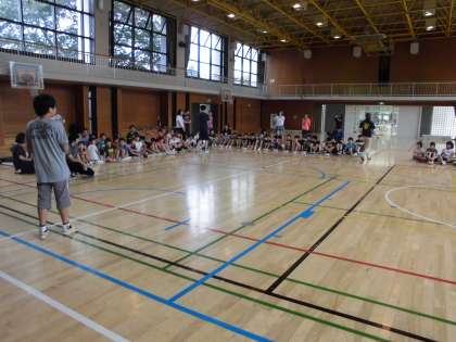 今日は、体育館で、祖師谷小学校ぽぷら学級、芦花小学校ひかり学級、明正小学校ひまわり学級の子どもたちと一緒に交流会をしました。