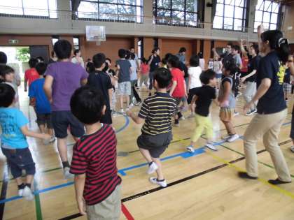交流会では、「名刺交換ゲーム」や「もうじゅうがりにいこうよ」を4校みんなで遊んだり、「みんな だいすき」の歌を歌いました。また、つくし学級の子どもたちは、運動会の時に踊った「どっかんマーチ」を他の学級の友達と一緒に踊りました。