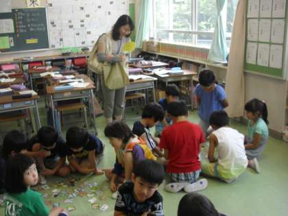 また、世田谷区の地域や行事を表した「世田谷かるた」を使って、かるた取りを楽しみました。「三軒茶屋」や「上祖師谷公園」など知っている言葉が出てくると子どもたちは喜んでいました。これからも社会科の学習等を通じて、世田谷区への理解を深めていきたいと思います。