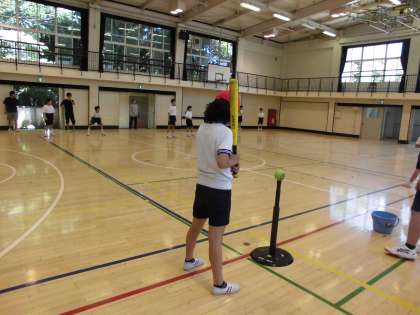 その後、実際にバットを使ってボールを打ちました。中学生に持ち方を教えてもらったり、ボールを置いて準備してもらったりして楽しく活動することができました。