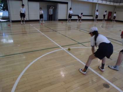 まず、一緒に準備運動をしてから中学生とペアになって、ボールの取り方や、投げ方を教えてもらいました。とても優しく教えてもらったことで、安心して活動する様子が見られました。