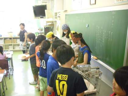 6年生がエプロン、マスク、三角巾を着用して給食の配膳を行いました。