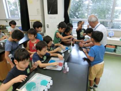 理科実験教室では、昨日に続いて“スライム作りを楽しもう!”のテーマで、昨日と違ったメンバーが参加し、中学生ボランティアのみなさんのアドバイスを受けながら、自分だけのスライムを作って楽しみ、お土産に持ち帰っていました。