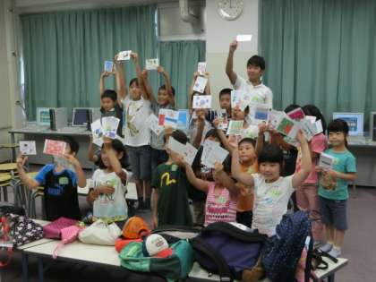 パソコン教室も3日目。“暑中見舞いのはがき作り”に力を発揮し、素敵な自分だけの暑中見舞いのはがきが仕上がっていました。最後に全員で記念写真。中学生ボランティアのみんさん、ありがとうございました。