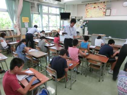 校内研究の指導をお願いしている 東京学芸大学教育学部情報教育研究室による体験学習会で、子どもたちの体験を支援してくださるとともに、操作している様子を調査・分析して、今後のICT活用授業への参考にするものです。参加した20名の子どもたちは、アンケート調査に回答したり、一人1台のタブレット型パソコンを操作し、算数の図形の面積の求積の仕方について自分の考えをまとめたり、友達の考えを相互に見合ったりしながら、1時間の活動に取り組みました。