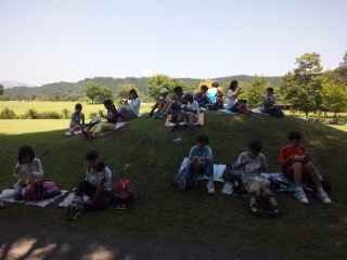 だいや川公園でのお弁当タイムです。緑広がる公園で、木陰を選んで行動班で仲よく食べています。これから日光東照宮へ向かいます。