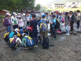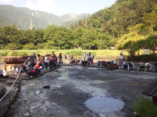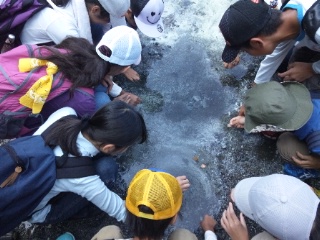 湯元の源泉に来ました。早速、用意してきた十円玉をわき出てくる湯に入れ、色の変化を観察しています。変化に驚く子どもたちです。
