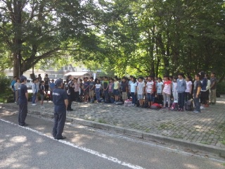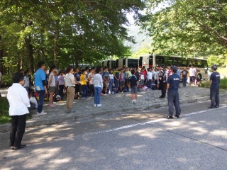 閉園式を宿舎近くの湯元駐車場で行いました。二泊三日お世話になったホテル山月の方々に感謝とお礼の気持ちを伝え、奥日光湯元を出発しました。いろは坂を下り、日光江戸村へ向かいます。