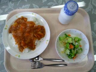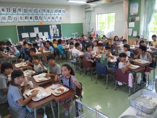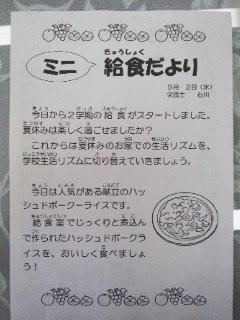 子どもたちが楽しみにしている給食が、今日から始まりました。今日の献立は、ハッシュド・ポークライス、ひとしおやさい、牛乳です。笑顔いっぱいの子どもたちです。