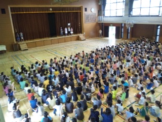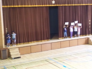 今日の児童集会は、集会委員会が企画した「これ、なんだ?」集会でした。ステージの幕間を一瞬にして通り過ぎる委員の持ち物や身に付けているもの、またはその色などを4つの回答例から当てるクイズゲームです。面白い選択肢もたくさんあり、盛り上がり楽しい集会となりました。
